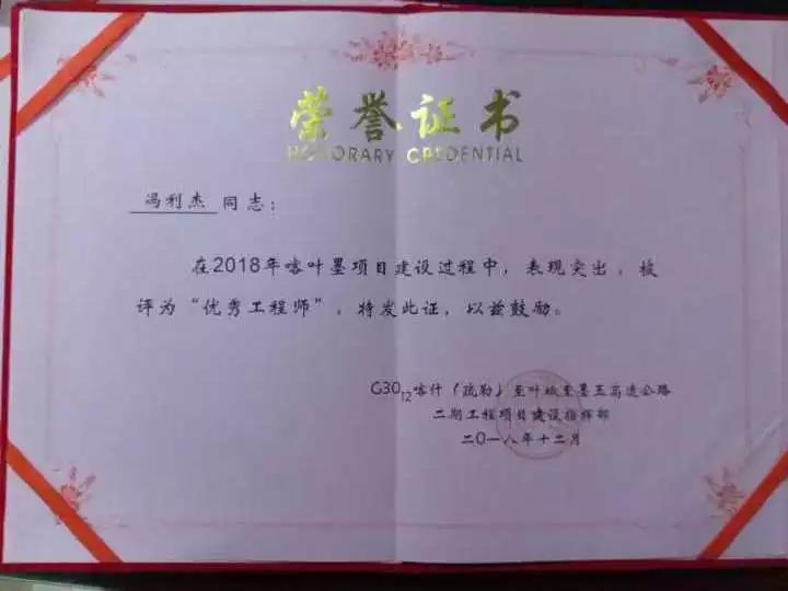 企业新闻新疆快讯 | 冯利杰荣获喀叶墨高速指挥部年度先进个人
