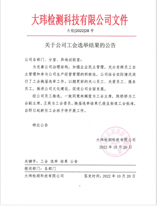2022年是大玮检测工会换届年,为把有能力的人推选到重要的工作岗位,公司在二、三梯队广发英雄贴,公开招募,民主推选!经过层层推荐、自荐,产生了第一批候选人。员工权益无小事,在党支部的组织下,公司总经理和党支部书记,亲自对候选人进行了严格的把关考核,围绕“工会是什么,做什么,怎么做,做到什么程度”面对面的问答,优中选优,最终确定了三位候选人。经工会成员选举产生了新一届工会主席林婉莹、副主席陈娇娇和工会委员王英,并已报茶山街道工会批准,走马上任。三位都是年轻才女,学历高、群众基础好,本职工作出色。她们敢于尝试、不畏艰难、勇担重任,相信大玮工会在青年才俊的领导下,关心员工、服务员工、回馈企业及社会等各项工作会更上一个新台阶,劳资关系会更加和谐。这次工会换届选举充分体现了大玮公司民主治理,“能者上,庸者让”勇于提拔新生代的人才观和用人理念。